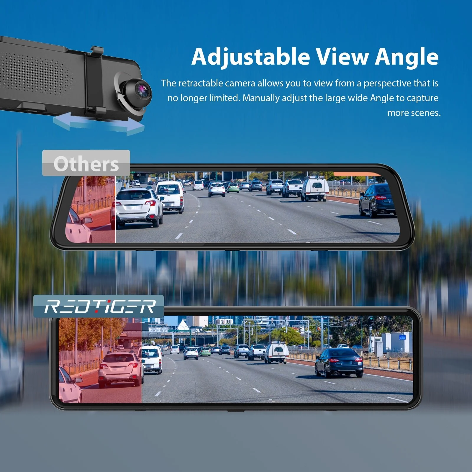 The REDTIGER T700 rearview mirror cameras records top quality video up to Ultra HD 4K 3840*2160P on front camara and 1920*1080P on rear camera,helps you read the key details like road signs, vehicle number plates and offers better-defined details. Besides, the front 170° and rear 150°wide-angle lens dual camera ensure to reduce blind area and providing sufficient evidence for rear-end collisions or collisions etc.